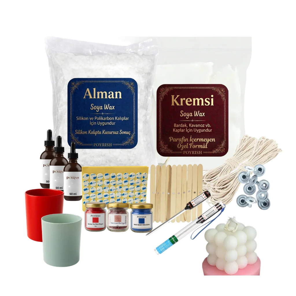 Evde mum yapımı artık çok kolay! Mum yapım seti sayesinde dilediğin kokulu veya dekoratif mumu kendin yapabilir, hobi olarak keyifle vakit geçirebilirsin. Mum yapım başlangıç seti, hem yeni başlayanlar hem de profesyoneller için uygundur. Soya wax mum yapım seti sayesinde tamamen doğal mumlar hazırlayabilirsin.